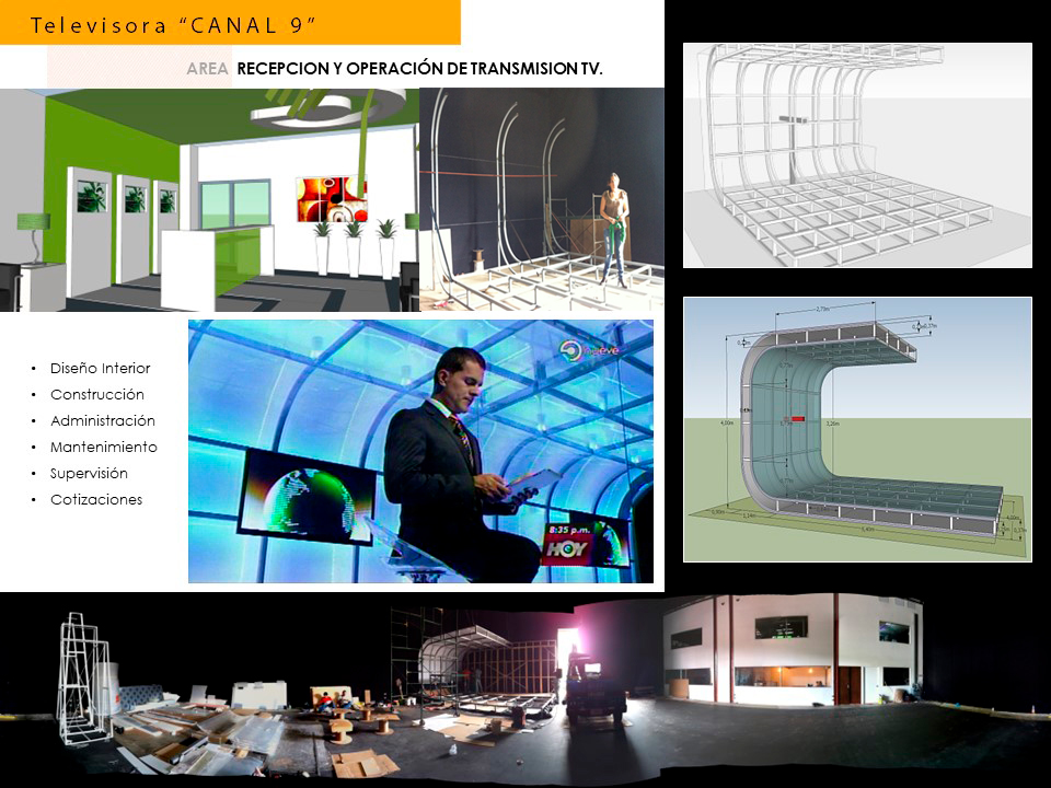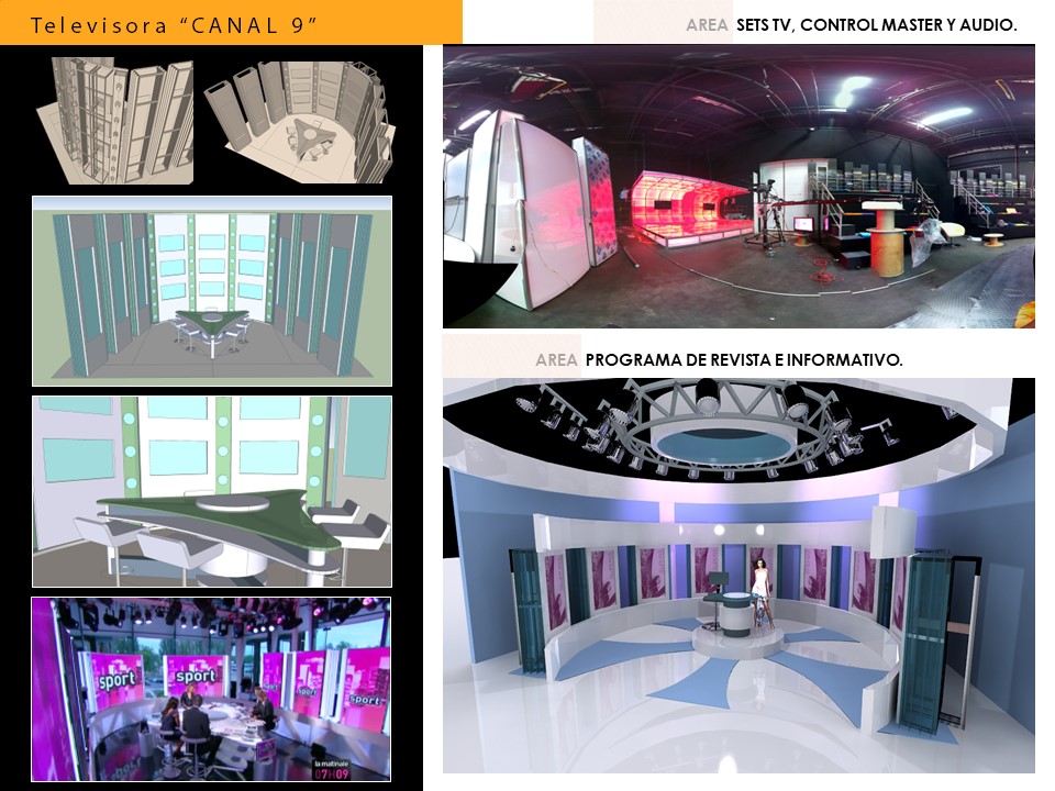 Su programa de necesidades se realizó para áreas de Oficinas, Sets de TV, salas de juntas, comedores, centros de Edición, cabinas de Audio, Control Master, Salas de Tecnología y Sistemas, Cuartos de Transmisión Satelital, Cuartos operativos de Ingenieros de Sistemas, Bodegas, Estacionamientos, Cuartos de Emergencia y Salas de Postproducción, Salas VIP, Green Rooms.